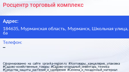 Росцентр, торговый комплекс по адресу 184635, Мурманская область, Мурманск, Школьная улица, 6а в дальнейшем Организация, размещена в следующих категориях: