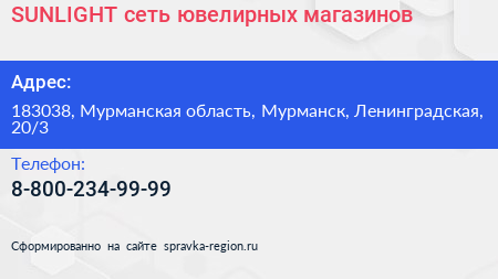 SUNLIGHT, сеть ювелирных магазинов по адресу 183038, Мурманская область, Мурманск, Ленинградская, 20/3 в дальнейшем Организация, размещена в следующих категориях: