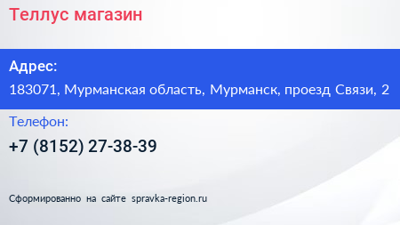 Теллус, магазин по адресу 183071, Мурманская область, Мурманск, проезд Связи, 2 в дальнейшем Организация, размещена в следующих категориях: