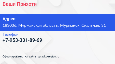 Ваши Прихоти по адресу 183036, Мурманская область, Мурманск, Скальная, 31 в дальнейшем Организация, размещена в следующих категориях:
