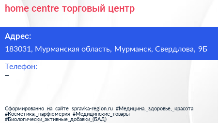 home centre, торговый центр по адресу 183031, Мурманская область, Мурманск, Свердлова, 9Б в дальнейшем Организация, размещена в следующих категориях: