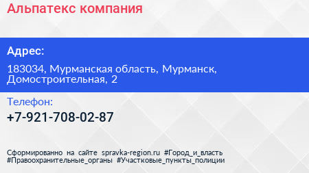 Альпатекс, компания по адресу 183034, Мурманская область, Мурманск, Домостроительная, 2 в дальнейшем Организация, размещена в следующих категориях: