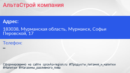 АльтаСтрой, компания по адресу 183038, Мурманская область, Мурманск, Софьи Перовской, 17 в дальнейшем Организация, размещена в следующих категориях:
