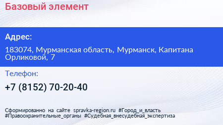 Базовый элемент по адресу 183074, Мурманская область, Мурманск, Капитана Орликовой, 7 в дальнейшем Организация, размещена в следующих категориях: