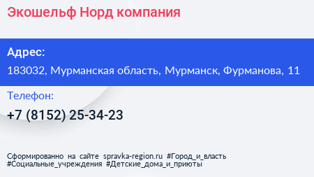 Экошельф-Норд, компания по адресу 183032, Мурманская область, Мурманск, Фурманова, 11 в дальнейшем Организация, размещена в следующих категориях: