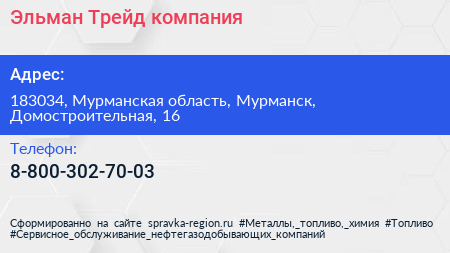 Эльман-Трейд, компания по адресу 183034, Мурманская область, Мурманск, Домостроительная, 16 в дальнейшем Организация, размещена в следующих категориях: