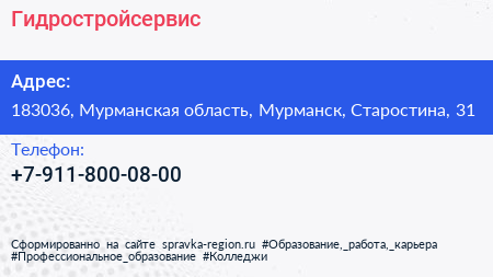 Гидростройсервис по адресу 183036, Мурманская область, Мурманск, Старостина, 31 в дальнейшем Организация, размещена в следующих категориях: