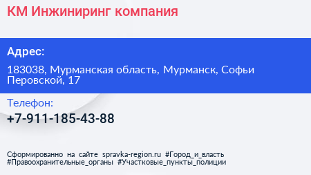 КМ Инжиниринг, компания по адресу 183038, Мурманская область, Мурманск, Софьи Перовской, 17 в дальнейшем Организация, размещена в следующих категориях: