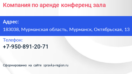 Компания по аренде конференц-зала по адресу 183038, Мурманская область, Мурманск, Октябрьская, 13 в дальнейшем Организация, размещена в следующих категориях: