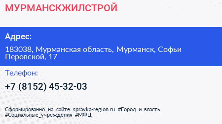 МУРМАНСКЖИЛСТРОЙ по адресу 183038, Мурманская область, Мурманск, Софьи Перовской, 17 в дальнейшем Организация, размещена в следующих категориях: