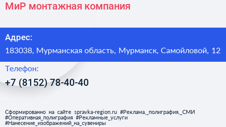 МиР, монтажная компания по адресу 183038, Мурманская область, Мурманск, Самойловой, 12 в дальнейшем Организация, размещена в следующих категориях: