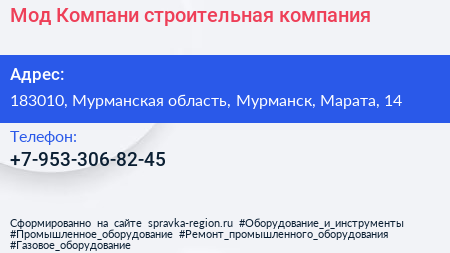 Мод Компани, строительная компания по адресу 183010, Мурманская область, Мурманск, Марата, 14 в дальнейшем Организация, размещена в следующих категориях:
