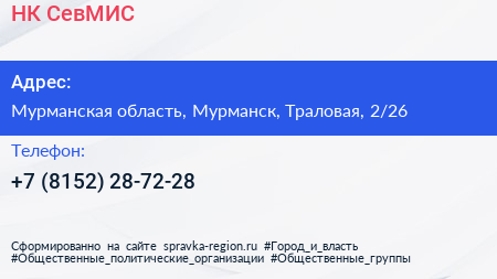НК СевМИС по адресу Мурманская область, Мурманск, Траловая, 2/26 в дальнейшем Организация, размещена в следующих категориях: