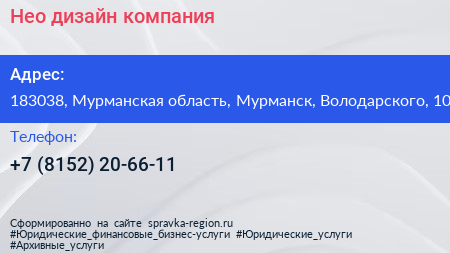 Нео дизайн, компания по адресу 183038, Мурманская область, Мурманск, Володарского, 10 в дальнейшем Организация, размещена в следующих категориях: