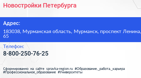 Новостройки Петербурга по адресу 183038, Мурманская область, Мурманск, проспект Ленина, 65 в дальнейшем Организация, размещена в следующих категориях: