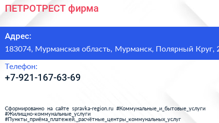 ПЕТРОТРЕСТ, фирма по адресу 183074, Мурманская область, Мурманск, Полярный Круг, 2 в дальнейшем Организация, размещена в следующих категориях: