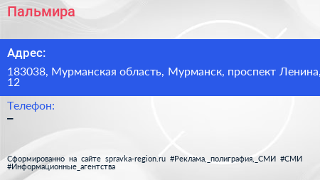 Пальмира по адресу 183038, Мурманская область, Мурманск, проспект Ленина, 12 в дальнейшем Организация, размещена в следующих категориях: