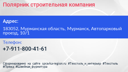 Полярник, строительная компания по адресу 183052, Мурманская область, Мурманск, Автопарковый проезд, 10/1 в дальнейшем Организация, размещена в следующих категориях: