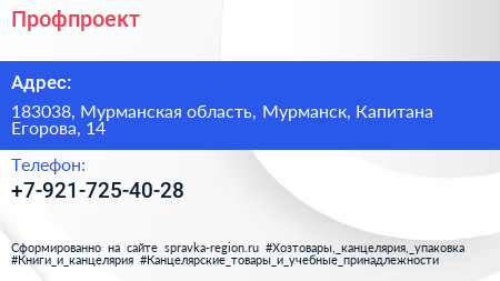 Профпроект по адресу 183038, Мурманская область, Мурманск, Капитана Егорова, 14 в дальнейшем Организация, размещена в следующих категориях: