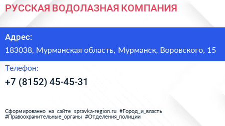 РУССКАЯ ВОДОЛАЗНАЯ КОМПАНИЯ по адресу 183038, Мурманская область, Мурманск, Воровского, 15 в дальнейшем Организация, размещена в следующих категориях: