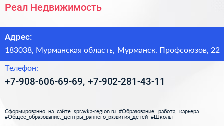 Реал Недвижимость по адресу 183038, Мурманская область, Мурманск, Профсоюзов, 22 в дальнейшем Организация, размещена в следующих категориях: