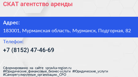 СКАТ, агентство аренды по адресу 183001, Мурманская область, Мурманск, Подгорная, 82 в дальнейшем Организация, размещена в следующих категориях: