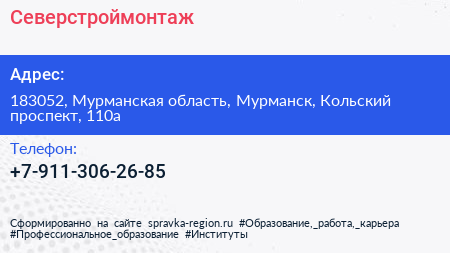 Северстроймонтаж по адресу 183052, Мурманская область, Мурманск, Кольский проспект, 110а в дальнейшем Организация, размещена в следующих категориях: