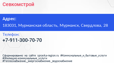 Севкомстрой по адресу 183031, Мурманская область, Мурманск, Свердлова, 28 в дальнейшем Организация, размещена в следующих категориях: