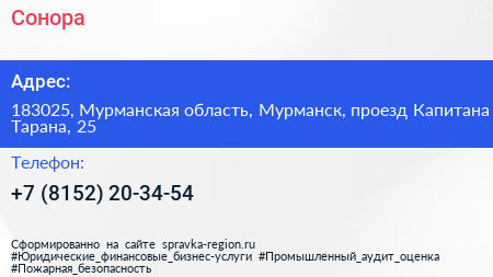 Сонора по адресу 183025, Мурманская область, Мурманск, проезд Капитана Тарана, 25 в дальнейшем Организация, размещена в следующих категориях: