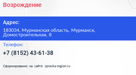 Возрождение по адресу 183034, Мурманская область, Мурманск, Домостроительная, 8 в дальнейшем Организация, размещена в следующих категориях:
