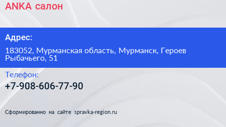 ANKA, салон по адресу 183052, Мурманская область, Мурманск, Героев Рыбачьего, 51 в дальнейшем Организация, размещена в следующих категориях: