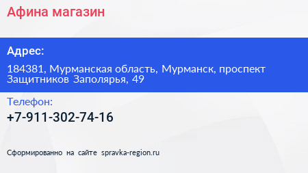 Афина, магазин по адресу 184381, Мурманская область, Мурманск, проспект Защитников Заполярья, 49 в дальнейшем Организация, размещена в следующих категориях:
