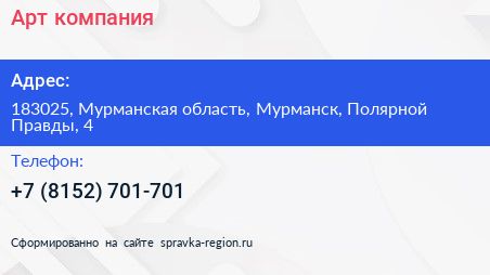 Арт, компания по адресу 183025, Мурманская область, Мурманск, Полярной Правды, 4 в дальнейшем Организация, размещена в следующих категориях: