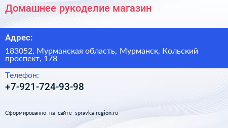 Домашнее рукоделие, магазин по адресу 183052, Мурманская область, Мурманск, Кольский проспект, 178 в дальнейшем Организация, размещена в следующих категориях: