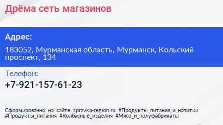 Дрёма, сеть магазинов по адресу 183052, Мурманская область, Мурманск, Кольский проспект, 134 в дальнейшем Организация, размещена в следующих категориях: