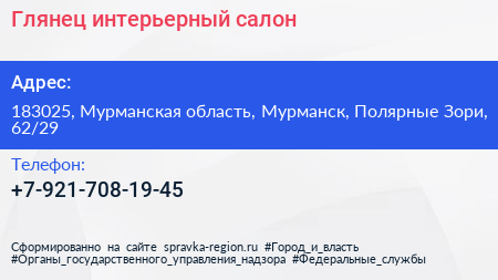 Глянец, интерьерный салон по адресу 183025, Мурманская область, Мурманск, Полярные Зори, 62/29 в дальнейшем Организация, размещена в следующих категориях: