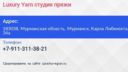 Luxury Yarn, студия пряжи по адресу 183038, Мурманская область, Мурманск, Карла Либкнехта, 34а в дальнейшем Организация, размещена в следующих категориях: