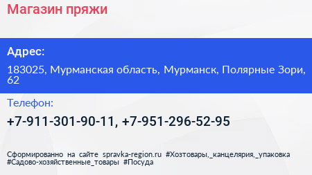 Магазин пряжи по адресу 183025, Мурманская область, Мурманск, Полярные Зори, 62 в дальнейшем Организация, размещена в следующих категориях: