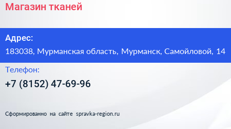 Магазин тканей по адресу 183038, Мурманская область, Мурманск, Самойловой, 14 в дальнейшем Организация, размещена в следующих категориях: