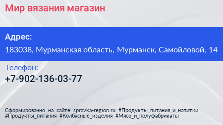 Мир вязания, магазин по адресу 183038, Мурманская область, Мурманск, Самойловой, 14 в дальнейшем Организация, размещена в следующих категориях: