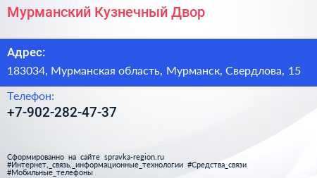 Мурманский Кузнечный Двор по адресу 183034, Мурманская область, Мурманск, Свердлова, 15 в дальнейшем Организация, размещена в следующих категориях:
