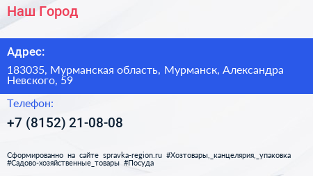 Наш Город по адресу 183035, Мурманская область, Мурманск, Александра Невского, 59 в дальнейшем Организация, размещена в следующих категориях: