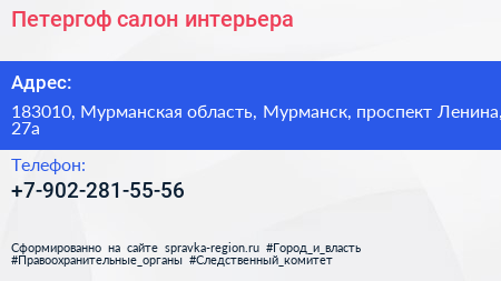 Петергоф, салон интерьера по адресу 183010, Мурманская область, Мурманск, проспект Ленина, 27а в дальнейшем Организация, размещена в следующих категориях: