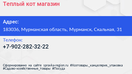 Теплый кот, магазин по адресу 183036, Мурманская область, Мурманск, Скальная, 31 в дальнейшем Организация, размещена в следующих категориях: