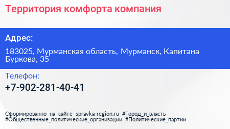 Территория комфорта, компания по адресу 183025, Мурманская область, Мурманск, Капитана Буркова, 35 в дальнейшем Организация, размещена в следующих категориях: