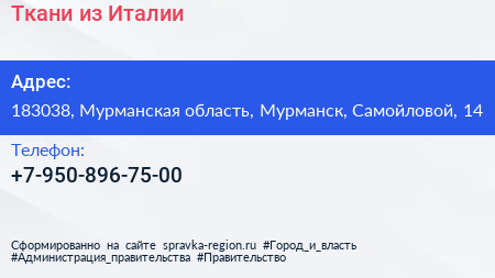 Ткани из Италии по адресу 183038, Мурманская область, Мурманск, Самойловой, 14 в дальнейшем Организация, размещена в следующих категориях: