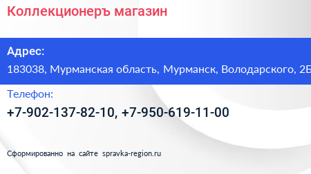 Коллекционеръ, магазин по адресу 183038, Мурманская область, Мурманск, Володарского, 2Б в дальнейшем Организация, размещена в следующих категориях:
