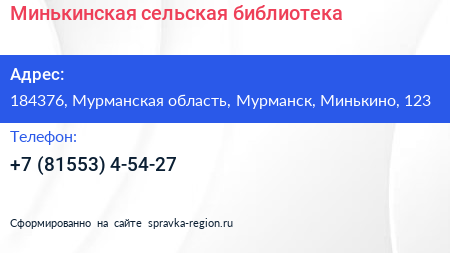 Минькинская сельская библиотека по адресу 184376, Мурманская область, Мурманск, Минькино, 123 в дальнейшем Организация, размещена в следующих категориях: