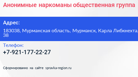 Анонимные наркоманы, общественная группа по адресу 183038, Мурманская область, Мурманск, Карла Либкнехта, 38 в дальнейшем Организация, размещена в следующих категориях:
