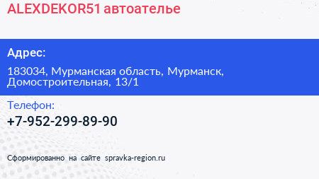ALEXDEKOR51, автоателье по адресу 183034, Мурманская область, Мурманск, Домостроительная, 13/1 в дальнейшем Организация, размещена в следующих категориях: